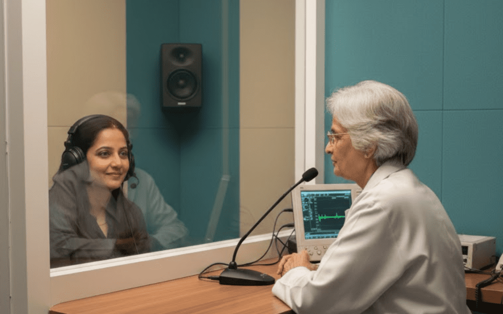 A speech audiometry evaluation goes beyond pure-tone testing, showing how clearly you can understand spoken words. People often say, “I can hear, but I can’t understand.” This test directly addresses that issue by measuring recognition, clarity, and processing of speech.